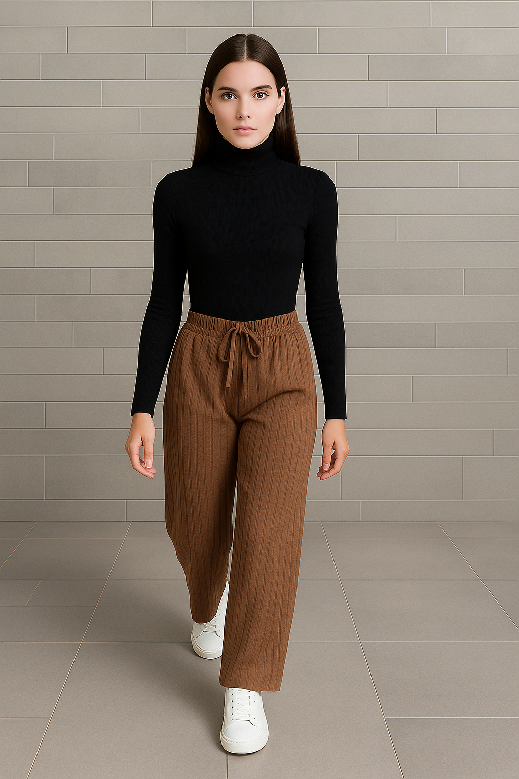 Doğal tonların sıcaklığını konforla buluşturan bu kahverengi ribana pantolon, evde geçirdiğiniz her ana şıklık katar. Yumuşak dokulu ribana kumaşı sayesinde hafif, esnek ve cilde dost bir kullanım sağlar. Geniş paça kesimi rahat hareket etmenizi kolaylaştırırken; lastikli bel ve kuşak detayı hem kullanım kolaylığı hem de zarif bir görünüm sunar.