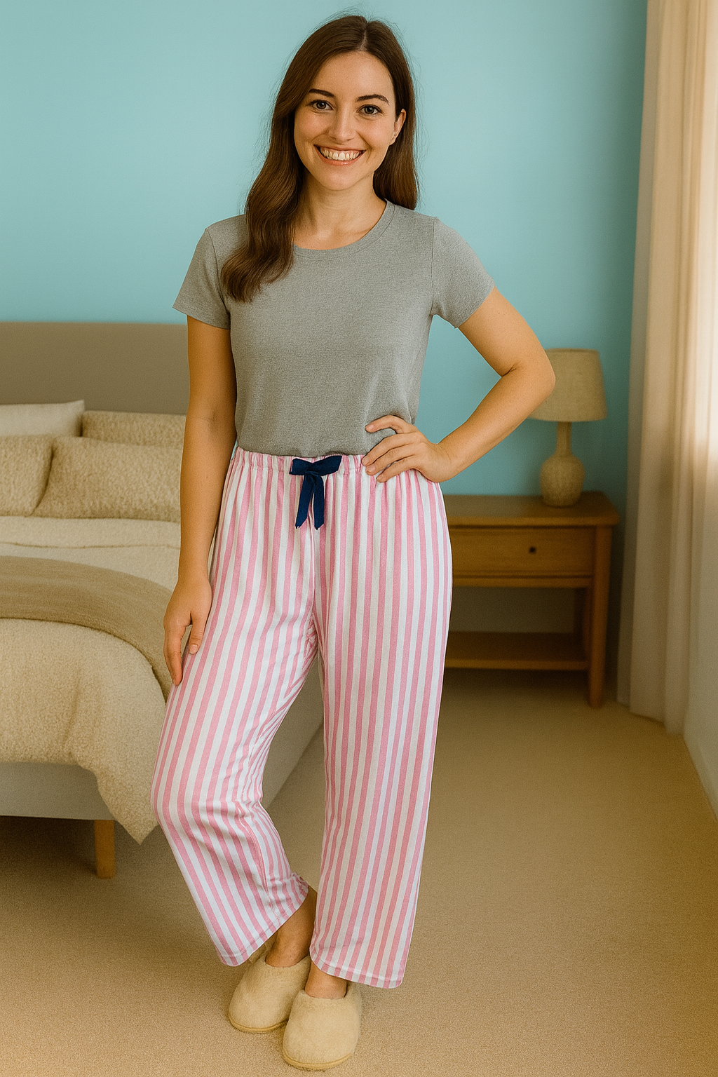 Rahatlığı ve şıklığı bir arada sunan bu pijama altı, evde geçirdiğiniz her anı daha keyifli hale getiriyor. Pembe–beyaz dikey çizgili modern tasarımı ile taze, enerjik ve zarif bir görünüm sunarken; lacivert kurdele detayı ürüne şık bir dokunuş katıyor. Yumuşak kumaşı ve esnek lastikli beli sayesinde gün boyu konfor sağlar.