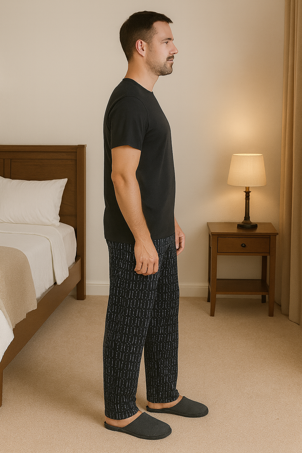 Şıklığı ve rahatlığı bir arada sunan bu siyah geometrik desenli pijama altı, modern görünümüyle ev stiline zarif bir dokunuş katıyor. Hafif ve yumuşak kumaş dokusu sayesinde gün boyu konfor sağlar. Lastikli bel yapısı vücuda uyum sağlayarak hem uyku saatlerinde hem de günlük ev giyiminde maksimum rahatlık sunar.