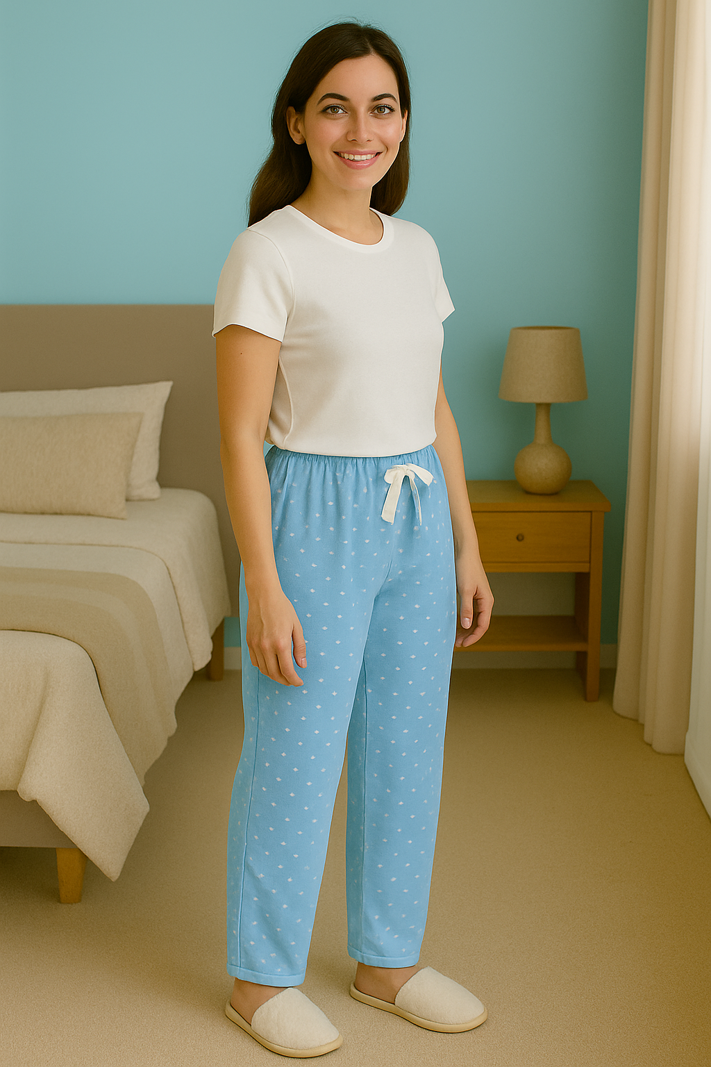 Ev rahatlığını zarif bir dokunuşla birleştiren mavi kalp desenli kadın pijama altı, gün boyu konfor sunan yumuşacık kumaşıyla öne çıkıyor. Açık mavi ton üzerine yerleştirilen minik beyaz kalpler, sade ama sevimli bir görünüm sağlayarak ev stiline taze bir enerji katıyor.