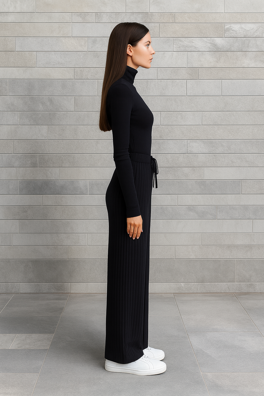 Minimalist tasarımı ve modern duruşuyla öne çıkan bu siyah ribana pantolon, evde konforu şıklıkla birleştirmek isteyenler için ideal bir parça. Dokulu ribana kumaşı sayesinde hem yumuşak bir his sunar hem de vücudu rahatsız etmeden esneklik sağlar. Geniş paça kesimi gün boyu rahat hareket imkânı tanırken, lastikli bel kısmındaki kuşak detayı pantolonun rahatlığını tarzla buluşturur.
